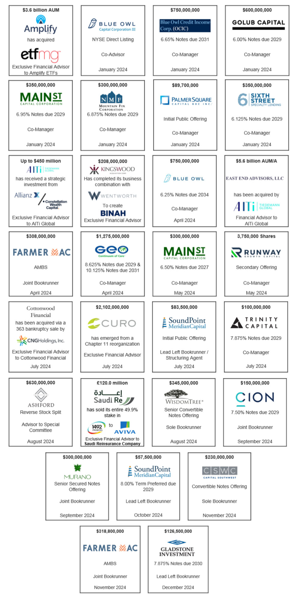 In 2024, Maple Rock’s Financial Institutions Investment Banking team had a dynamic and successful year, executing a wide range of transactions and providing tailored solutions to meet the diverse needs of their clients. Through strategic capital markets activities and expert advisory services, the team demonstrated their commitment to delivering exceptional results and creating lasting value.