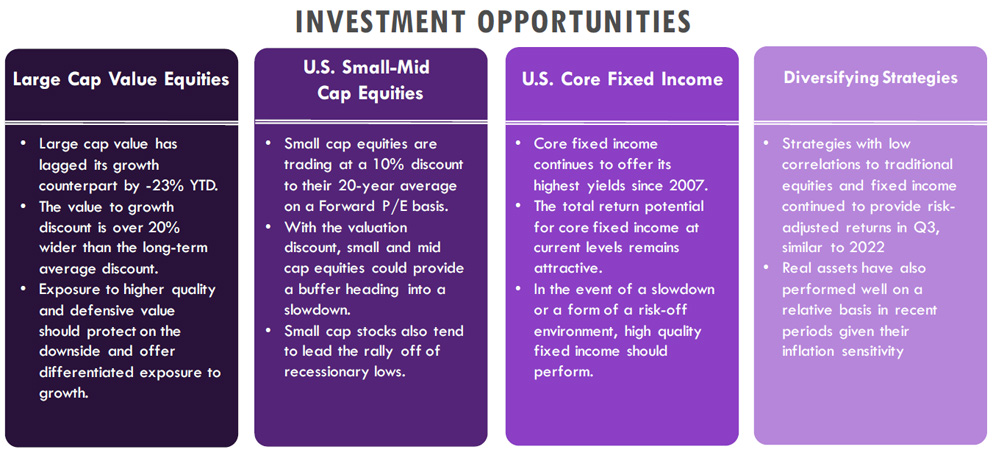 In our view, instead of chasing the return drivers of early 2023, investors should remain diversified and ensure appropriate allocations to a variety of other asset classes with lower correlations to growth equity. Within equity markets, large cap value and smaller market cap stocks have the potential to provide attractive risk/return profiles at more reasonable valuations. Equity risk should be appropriately balanced with meaningful allocations to core fixed income and diversifying strategies that look increasingly attractive in today’s economic and interest rate environment. Many investors have been sitting on excess cash reserves given the high short-term rates, but there is an opportunity cost to sitting on the sidelines and capital appreciation may be missed if markets move quickly.